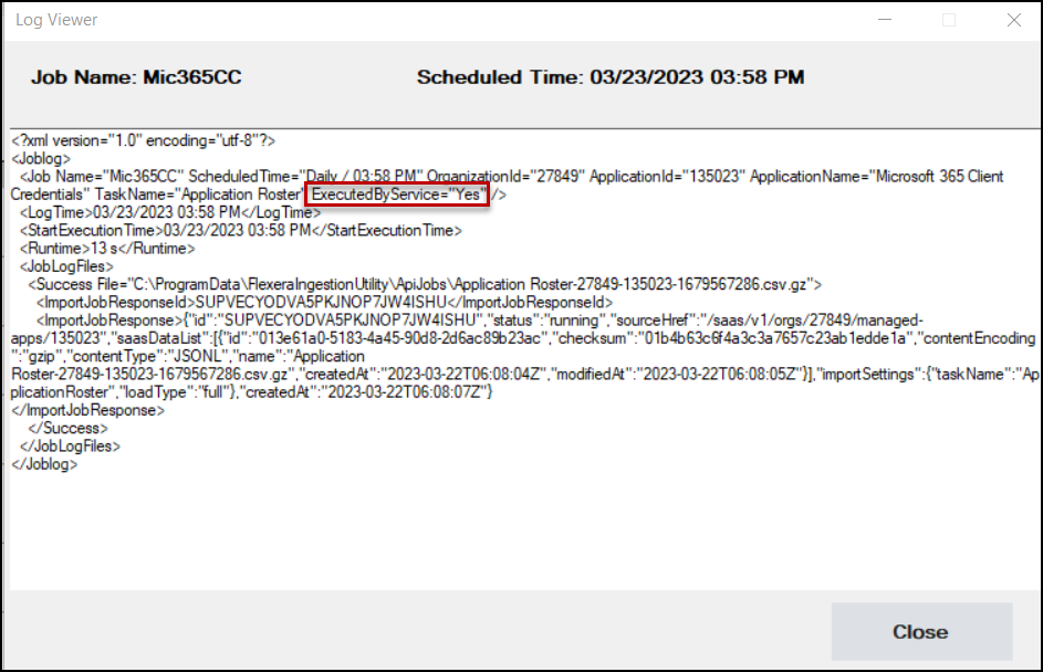 ViewClick the View link to open the Log Viewer , which displays the Job Log information for the scheduled job run. See the following sample screenshot. If you selected the Advanced installation option in Installing FSM Data Ingestion Utility to run FSM Data Ingestion Utility as a Windows Service, the Job Log information displays the XML attribute ExecutedbyService=“Yes” next to the TaskName. For details, see the red box in the following screenshot.